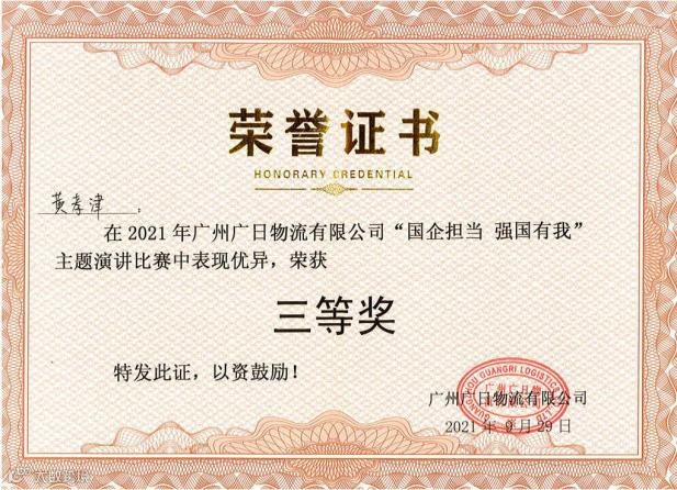 黄孝津同志,任职于广州广日物流有限公司生产部。初入公司的他能力突出,勤于思考,经常与生产技术团队一起攻坚克难,突破技术瓶颈,与团队共同申报并成功获得4项实用新型专利,同时还与团队共同申报了1项发明专利;对于从未接触过的领域,他刻苦钻研,努力克服自己内心的恐惧,将自己能做的、该做的努力做到尽善尽美,2021年获得公司组织的“国企担当,强国有我”演讲比赛的三等奖,并在2022年初获评“2021年先进个人”称号。他说:“他山之石,可以攻玉”,在团队中,只有大家互相学习与借鉴,才能为企业创造更大的效益。