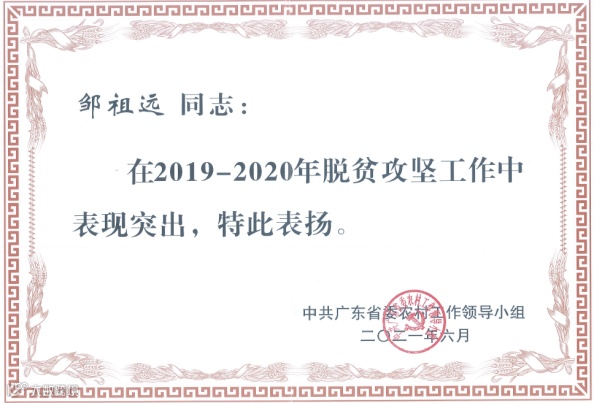 邹祖远同志,任职于广州广日物流有限公司安全动力保障部。2016年5月-2021年7月,邹祖远同志被派驻到清远市阳山县阳城镇元江村担任驻村扶贫干部。扶贫期间,他积极融入集体,积极探索扶贫新思路,将工作重心放在党建引领、产业帮扶、教育帮扶、改善村居环境、就业帮扶以及救助帮扶等方面,贯彻落实各项帮扶措施,在脱贫攻坚工作中表现突出,2021年荣获广东省农村工作领导小组颁发荣誉证书,2022年获得“最美乡村振兴人”称号。他说:以自己的微薄之力为社会做贡献,收获的不仅仅是荣誉,也是为了心中的那份信仰。
