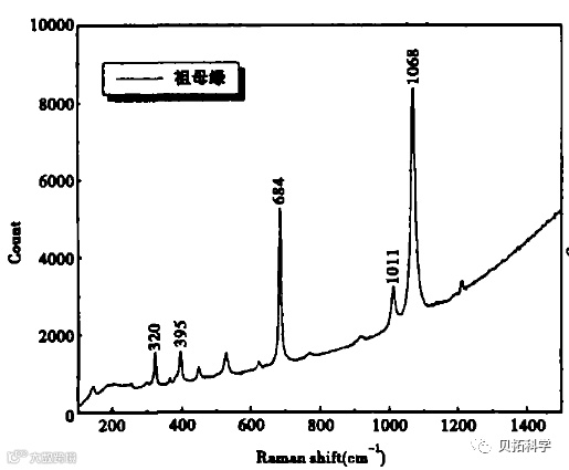 祖母绿是一种含铍铝的硅酸盐,为一种绿柱石亚种,化学成分为Be3Al2 [Si6O18],具有浓艳的绿色,属高档宝石,图3是祖母绿的一个典型的拉曼光谱,四个强的特征峰分别是1068cm-1,684cm-1,395cm-1,320cm-1。图4是自称清代朝珠,祖传祖母绿的一个样品检测结果。结果显示该样品主要成分是SiO2。