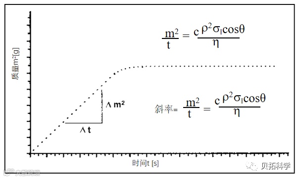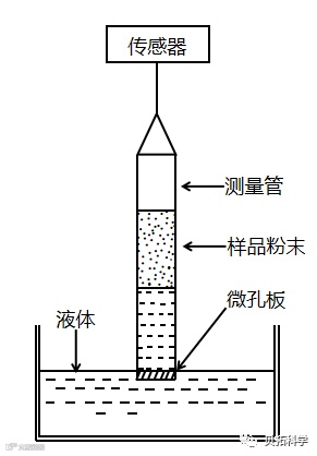 在Washburn测试中,底部带有滤器的测量管装有粉末与测试液体接触,由于毛细管效应液体上升,管内增加的质量与时间会被记录。如下图。