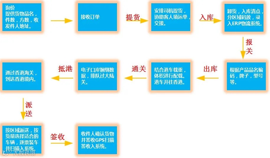 货物运输:放行后,货物由过境中港车运至香港中港运输公司仓库或者港车直送到客户手中。