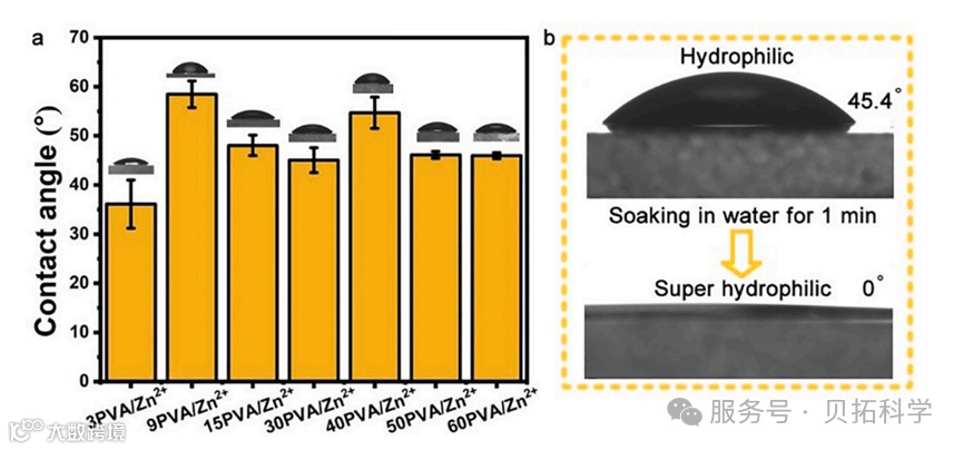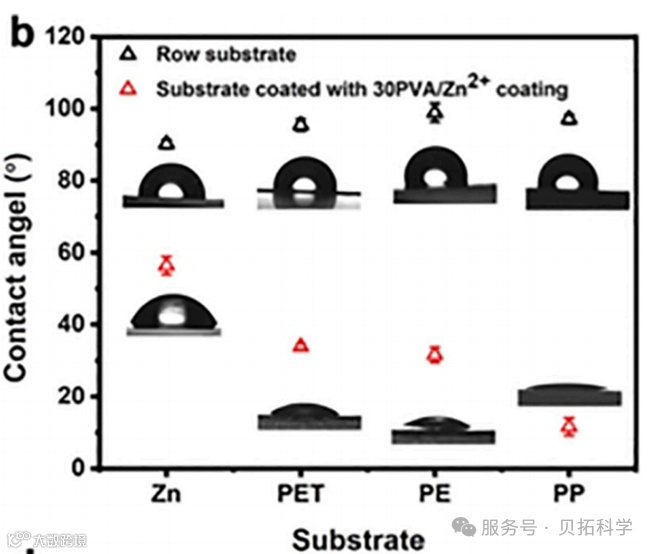 30PVA/Zn²⁺涂层:接触角仅37.6±0.86°,且浸泡1分钟后进一步降至超亲水状态(图1)。