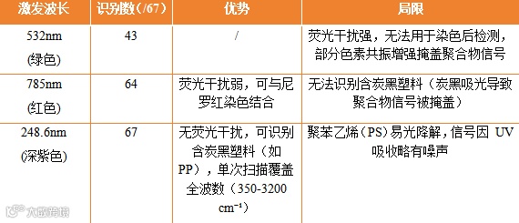 研究团队针对 67 个有色塑料颗粒(含炭黑、蓝色、棕色等),测试了三种拉曼激发波长的表现,结果令人瞩目: