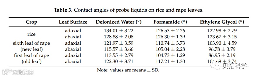 He等通过研究水稻和油菜叶片的SFE差异,以及多种因素对润湿性的影响。即考察作物类型、叶片表面、探针液、叶片状态对接触角的影响以及水稻和油菜叶片中SFE及其组分的差异。测定了三种探针液体(去离子水、甲酰胺和乙二醇)在水稻和油菜叶片正面和背面的接触角,并比较了油菜叶片状态(油菜第六叶和油菜第一叶)。采用OWRK方法计算了水稻和油菜叶片的SFE及其极性组分和色散组分。