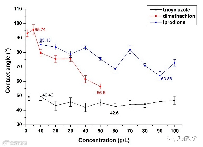 为了考察PPP浓度对油菜叶片润湿性的影响,将20%可湿性粉剂三环唑、40%可湿性粉剂二甲沙龙和25%悬浮剂异丙二酮按农化标签推荐用量分为不同浓度梯度。接触角随三种ppp浓度的变化如图2所示。