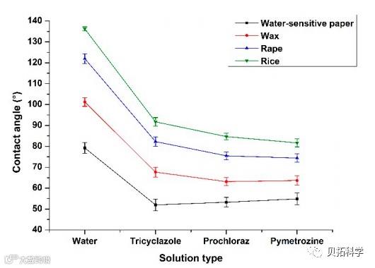 图1比较了用不同PPP测试的四种固体表面的润湿性。可以看出,四种固体表面的亲水性从高到低依次为WSP、蜡、油菜叶和水稻叶。当使用水进行实验时,只有与WSP的接触角小于90°并且表现为亲水性,而具有稻叶、油菜叶和蜡的水滴表现为疏水性。此外,用三种PPP替代水滴后,水稻叶片的润湿性由疏水性变为亲水性,其中吡蚜酮的使用使水稻叶片的润湿性大大提高,接触角降低到80°左右。