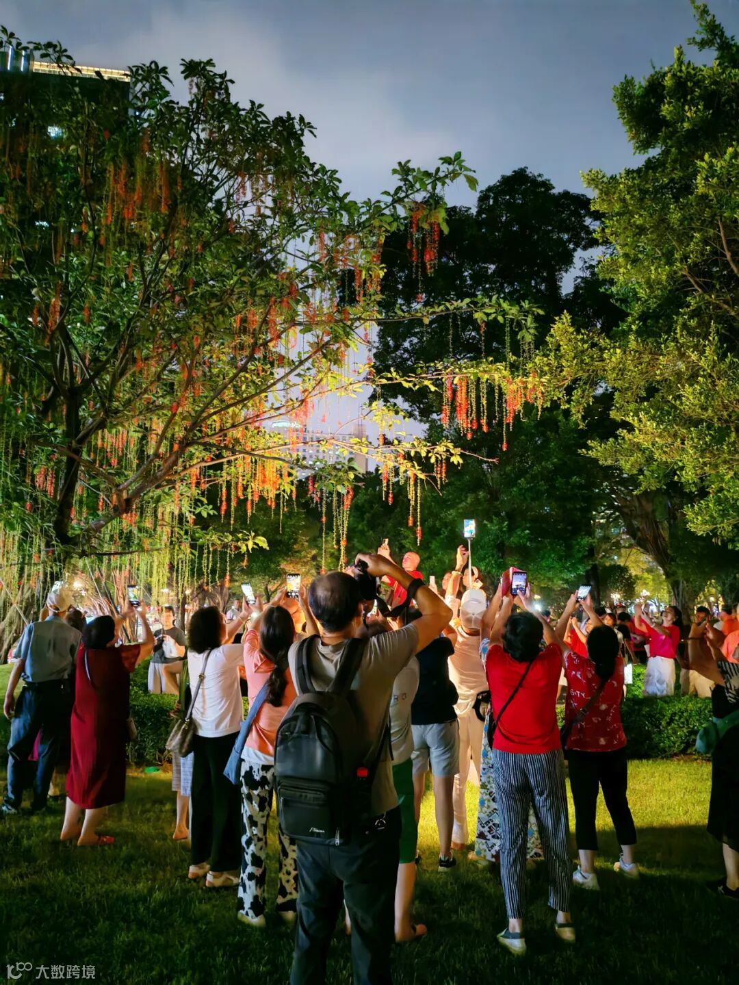 暮色渐浓时,广州市人民公园的红花玉蕊树下聚集了众多市民。有人静立仰望,有人低声赞叹,有人驻足与花串合影,有人架设摄像机记录,亦有携带画具的老者支起画架,将花影定格于画纸之上。市民以各自的方式,欣赏并留存这仲夏夜短暂的红色景致。清晨,花朵虽会闭合,但绽放时的模样已留存于人们的记忆中,花城的生机在这样的循环中持续焕发。