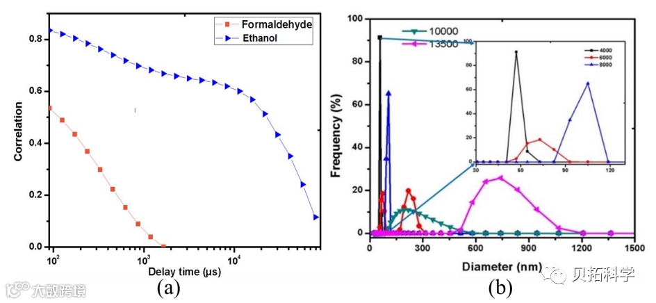 图2. (a)加入甲醛和乙醇后尿晶的强度自相关曲线 (b)过滤后离心15分钟对尿样粒径结果的影响
