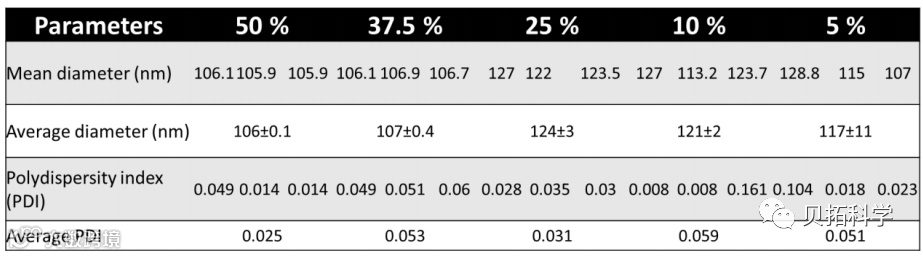 表1. 稀释对粒径、平均粒径、多分散性指数和平均PDI的影响