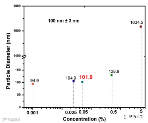 首先对仪器进行校正。将粒度为100±3 nm的纳米球样品用NaCl (5%, 0.5%, 0.05%, 0.025%, 0.001%)溶解。图1显示了纳米球样品的粒径曲线与NaCl溶剂浓度的关系。如图所示,在NaCl浓度为0.05%的条件下对纳米微球粒径的检测效果较好,主要表现在以下几个方面。纳米球在0.05% NaCl溶液中的粒径最接近实际粒径(101.9 nm)。其他浓度分别为94.9 nm、104.9 nm、128.9 nm、1634.5 nm。