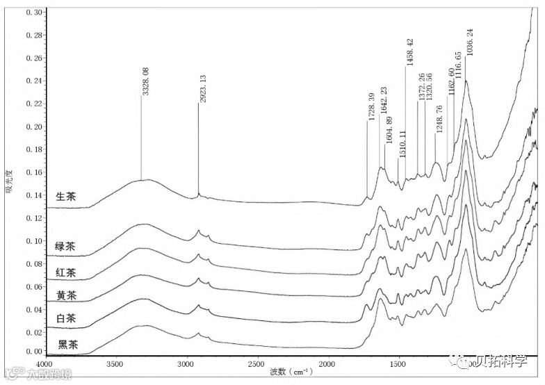 傅立叶变换红外光谱仪(FTIR)检测分析后可以发现:绿茶和白茶经进一步加工处理后保留了更多鲜叶的品性,黄茶则有所改变。通过各个吸收峰强度的分析比较,可以发现茶鲜叶经加工处理后具有更高的营养价值,特别是加工成红茶和黄茶,它们含有更多的茶多酚、多糖和蛋白质等营养物质。