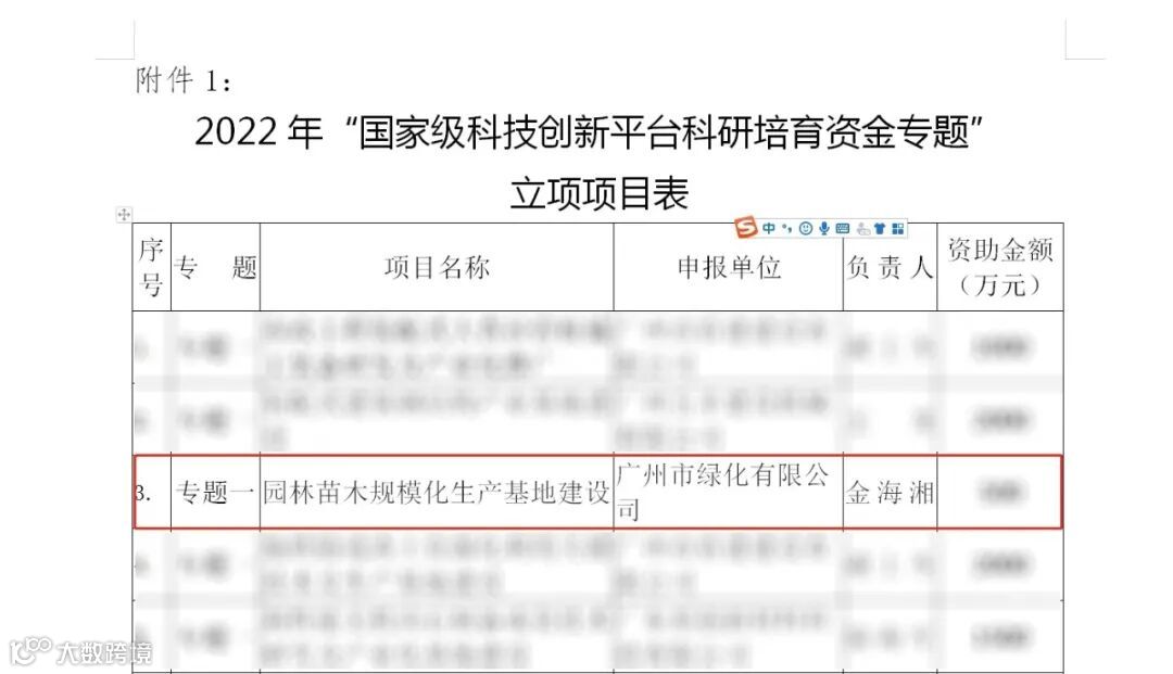 根据《广州市建筑集团有限公司关于公布2022年科技计划项目立项的通知》(建集〔2022〕218号),广州市绿化有限公司申报的专题一(产业基地建设及设备研发):园林苗木规模化生产基地建设获得广州市建筑集团有限公司科技计划项目2022 年度“国家级科技创新平台科研培育资金”专题立项。