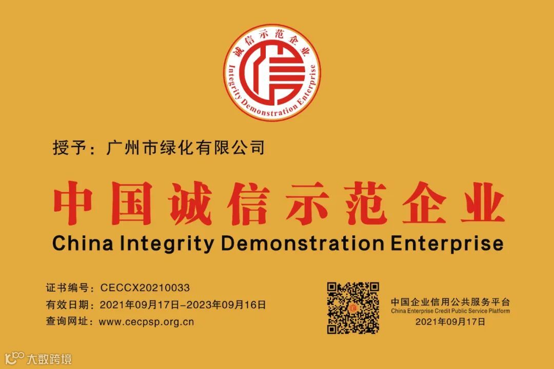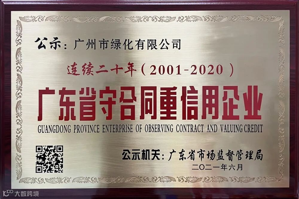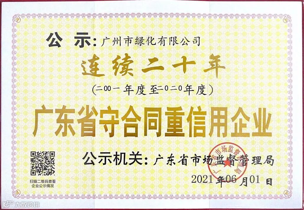 喜讯!近日,广州市绿化有限公司先后荣获2020年度广州市“守合同重信用”单位、连续二十年广东省守合同重信用企业、中国诚信示范企业等荣誉称号。