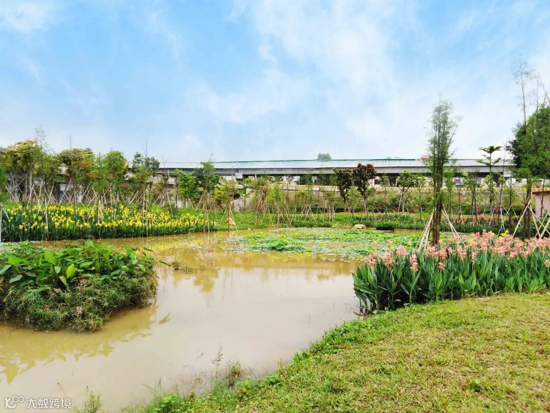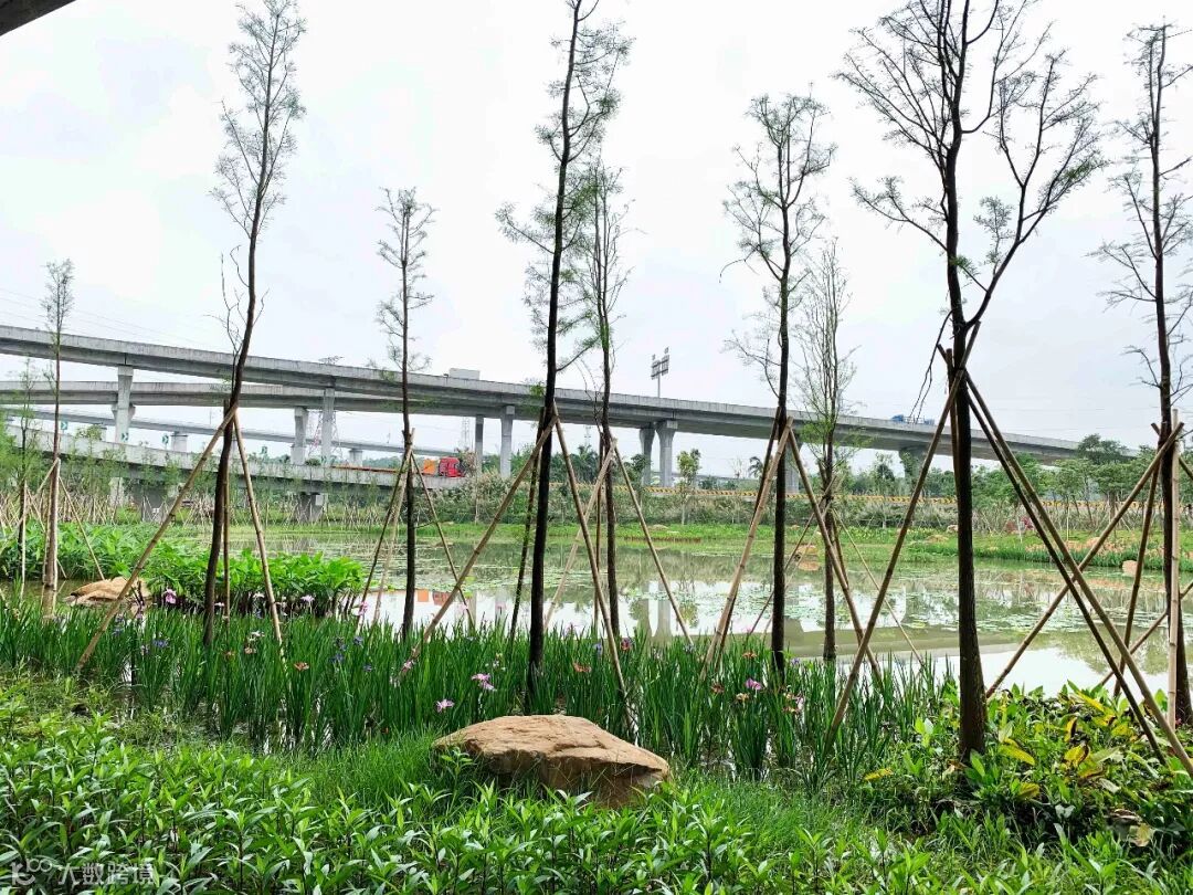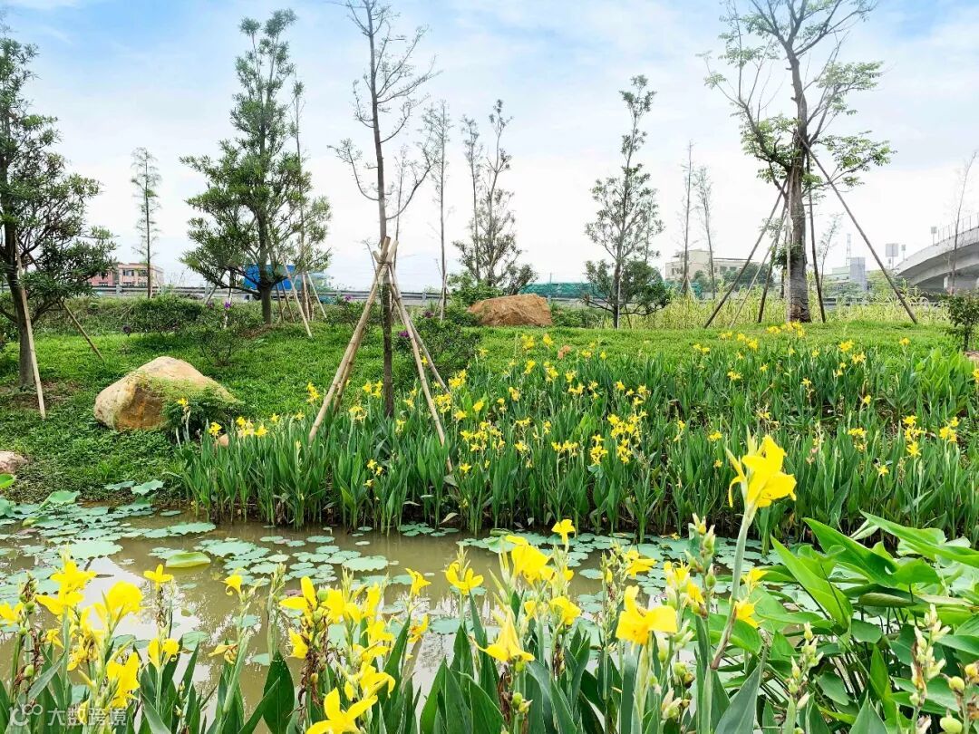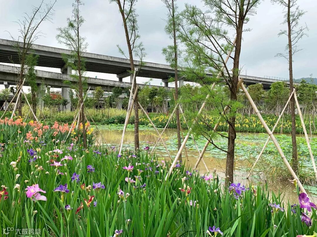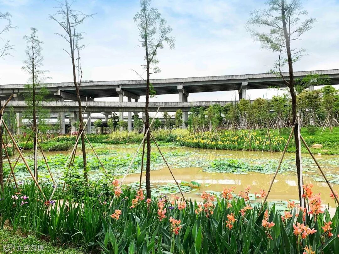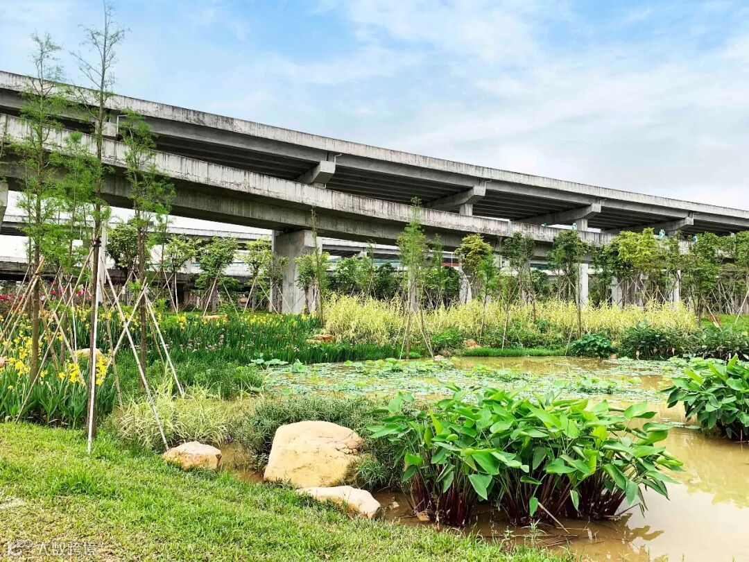 该项目作为广州城区必经的高快速路出入口景观项目之一,是具备典型的广州市绿化识别特征的景观绿地,也是规划的生态景观节点。结合广州市生态廊道建设的目标,选择开花乔木为主要植物景观,根据车行视线打造片植花海景观和自然式乔木搭配地被及草坪的通透景观,形成季相景观突出、花色丰富的立交绿化效果,突出广州花城的形象。该项目结合现场周边市政排水系统不完善的情况,科学地布置湿地,利用湿地的蓄水功能,缓解排水压力,湿地内巧妙点缀相态各异的景石,配置多种开花水生植物,不仅是湿地,更丰富了整体立交的绿化景观效果。