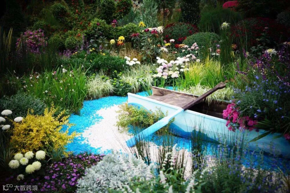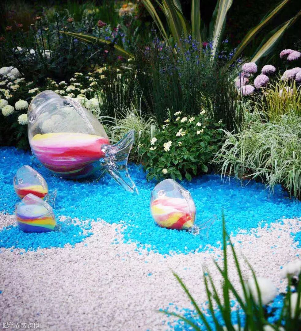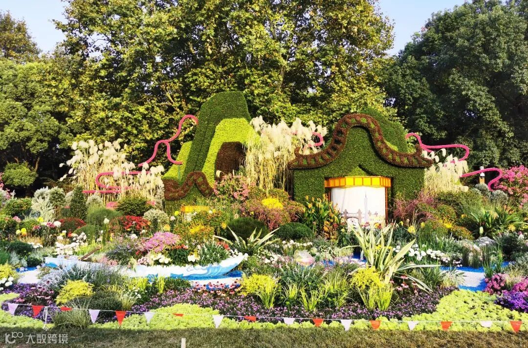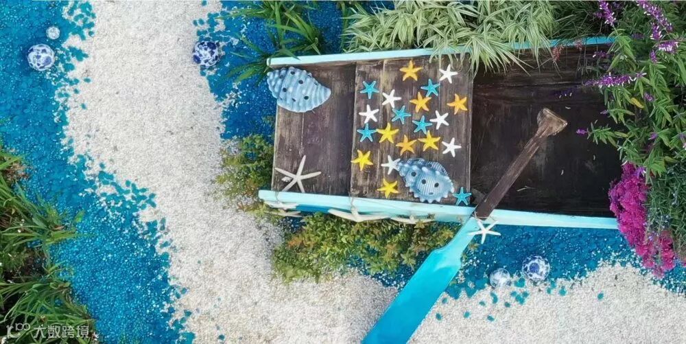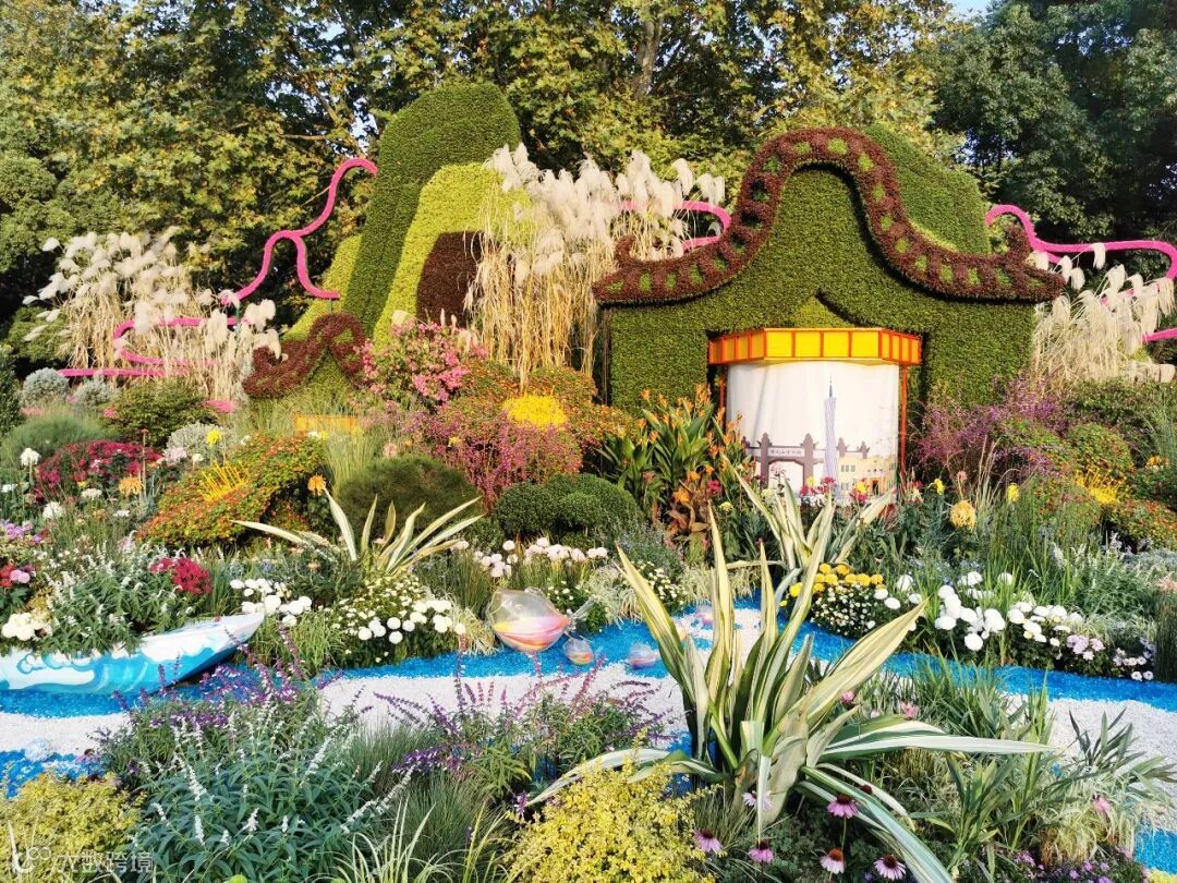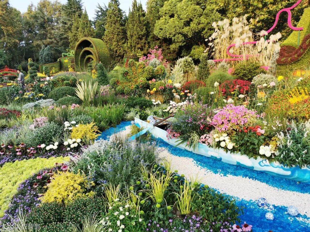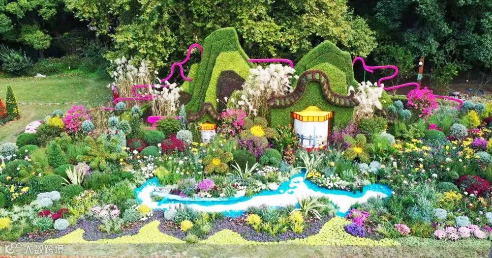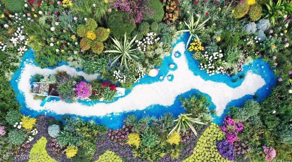 此外,色彩搭配上将整个菊类彩色融入自然风格的基底之中,使得传统菊花布展形势得到尝试性变化,珠江水、海洋、丝路瓷文化、彩砂鱼、花船等景观元素的注入,既平衡了菊花的整体色彩,也生动展示了花城的山水自然景观与人文元素。