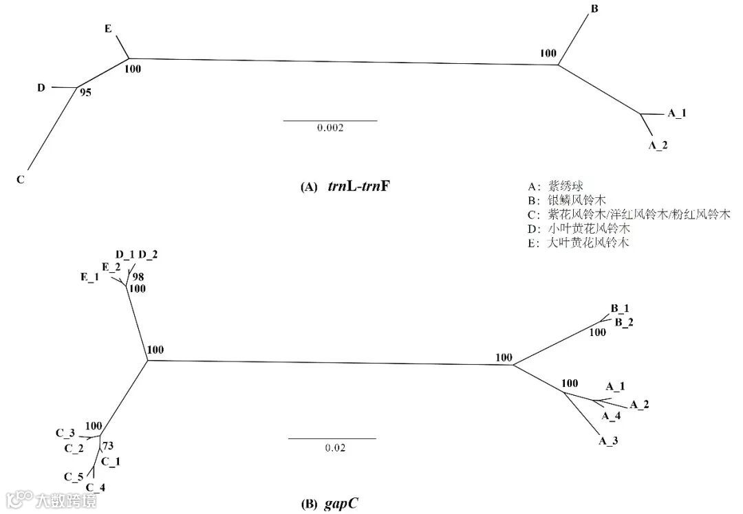 图3 基于trnL-trnF(A)和gapC基因(B)构建的华南地区栽培的风铃木类物种系统发育树