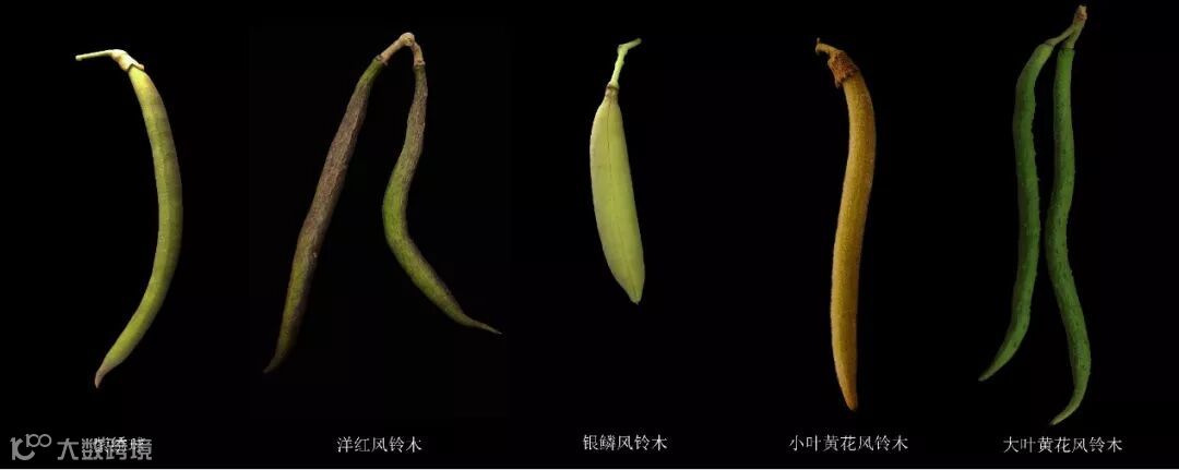 图2 风铃木类4个物种(包括2个亚种)的果实及萼片