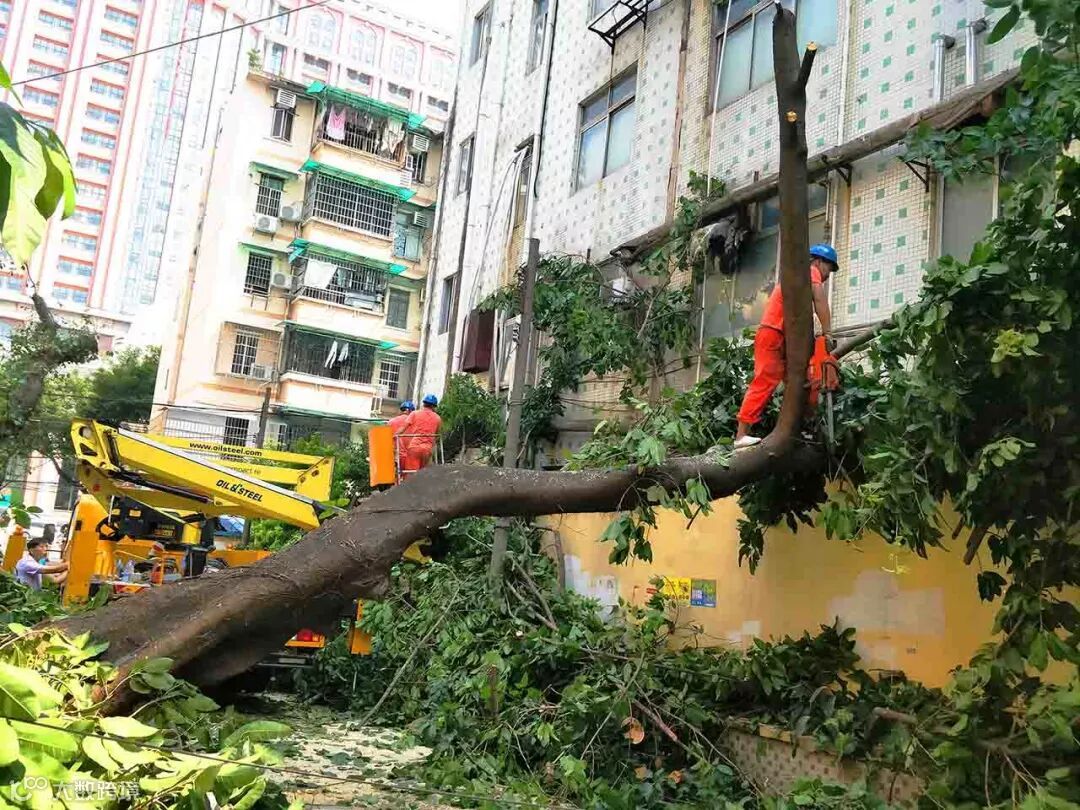 8月24日晚,市绿化公司城市绿化抢险队接到110报警中心的报案转介:海珠区工业大道中福南新街33号-35号大院门前一棵胸径为80公分的大叶榕倾斜倒塌在人行道上,树枝压在电线上,并压住对面的楼房,情况十分危急,要求抢险队立即前往排除险情。
