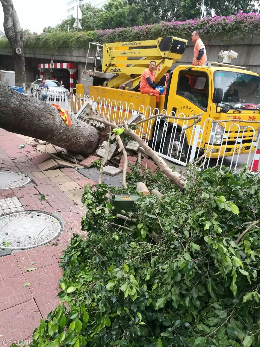 城市绿化抢险队启动绿化抢险应急行动预案,履行服务承诺,保障台风登陆期间抢险救援顺利进行。