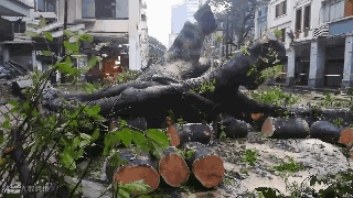 南华中路,大叶榕倒伏,抢险人员据断枝