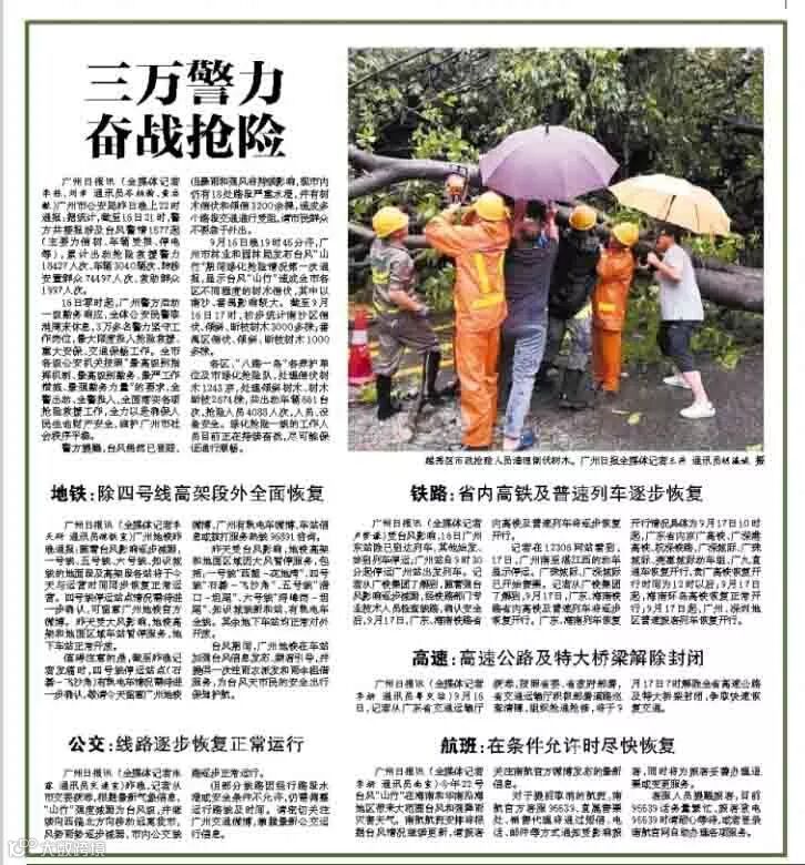 台风“山竹”逐步向广东逼近,其巨大的破坏力使广州市区遭受到前所未有的严重影响和破坏,城市绿化抢险队陆续接收局总调度中心、110接到局总调度中心、市民的险情来电。抢险队员们无惧风雨,迎风而上,持续奋战在抗灾抢险一线,为市民的生命安全保驾护航。21时市政府宣布将防台风应急响应降为Ⅱ级,并要求17日全市复工(业)、复产、复市。