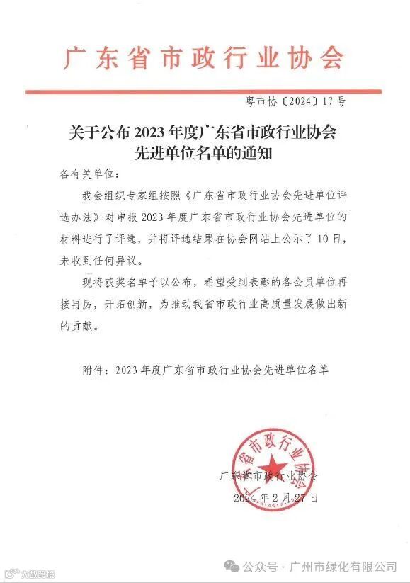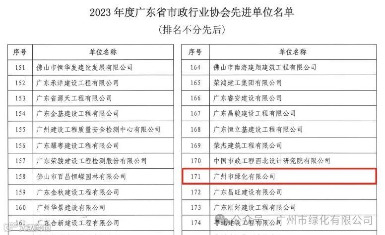 龙年伊始,广州市绿化有限公司取得开门红好成绩,获评2023年度广东省市政行业协会先进单位。广州绿化于2022年加入广东省市政行业协会,入会后积极参与协会各项活动并取得优良成绩。