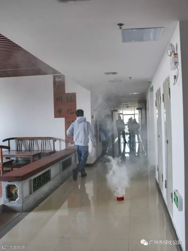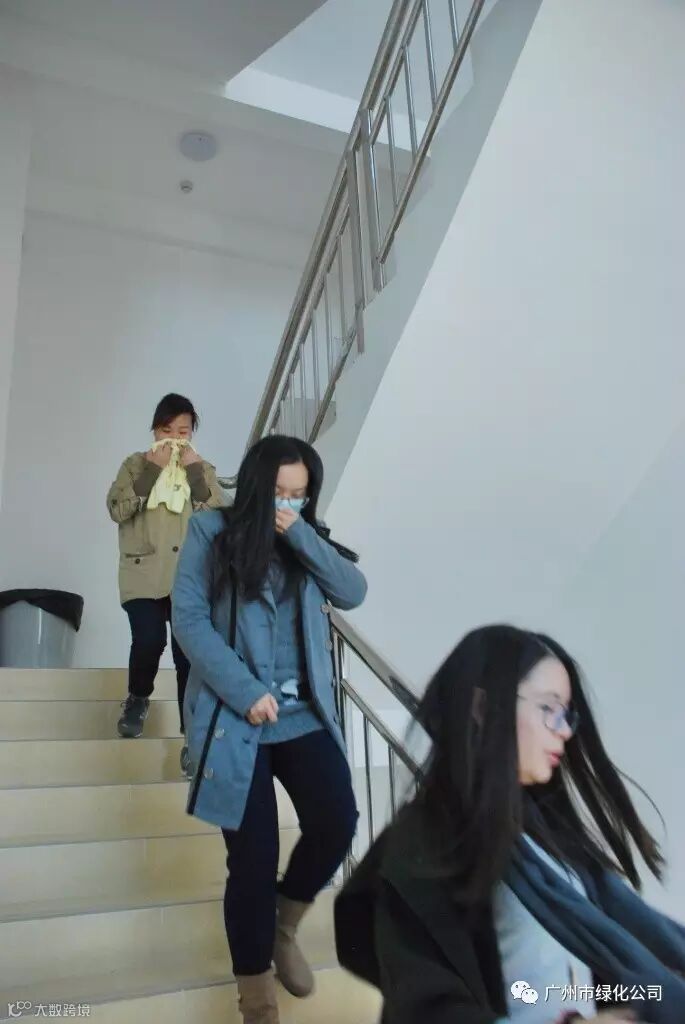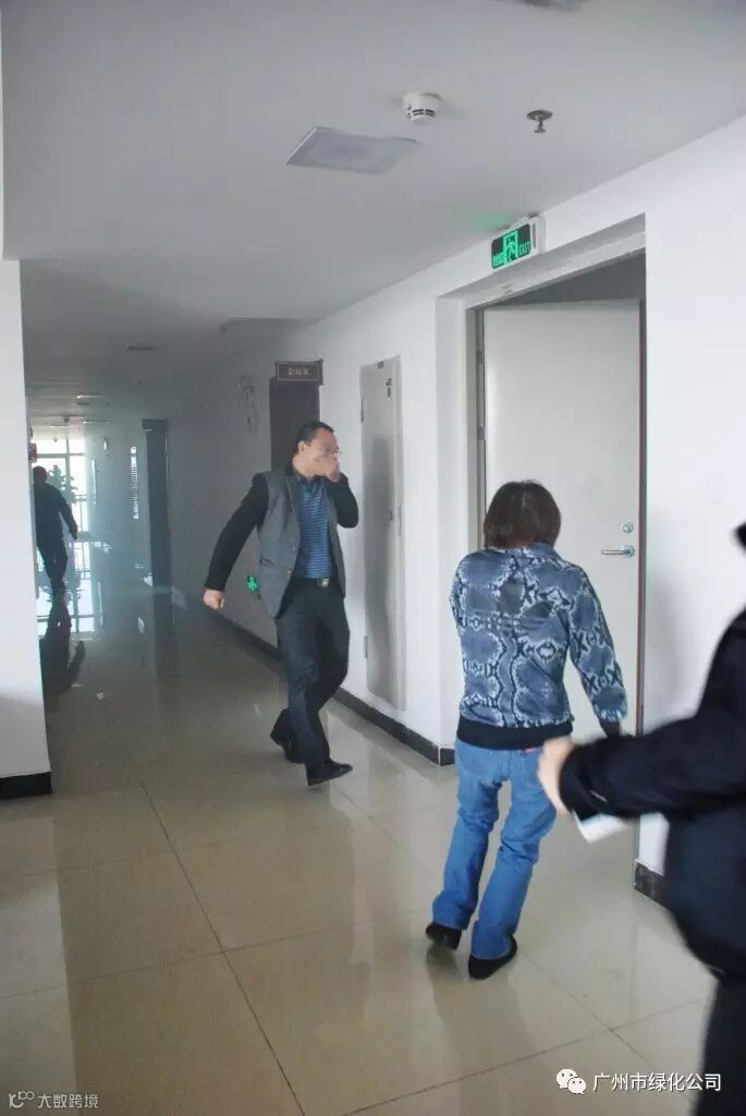 10点正,公司朱峰副经理一声令下,工作人员点燃烟饼,消防警铃响起,各楼层人员用湿毛巾捂住口鼻,通过最近的消防通道迅速到达大院空旷处。