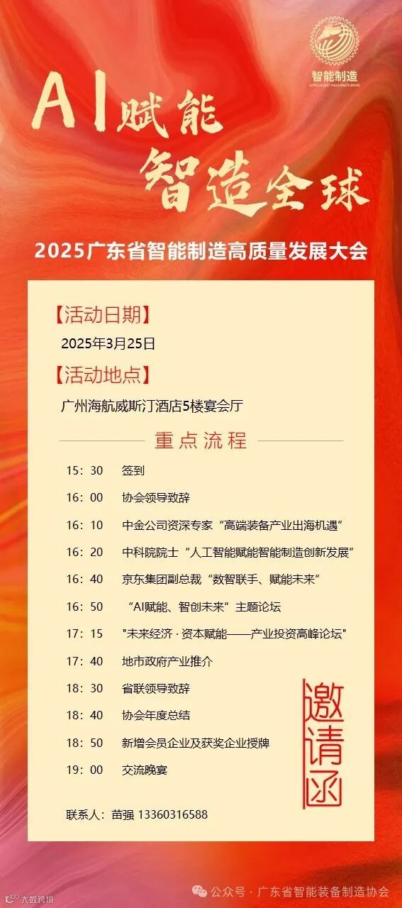 为深入学习贯彻2025广东省高质量发展大会精神,推动广东省智能制造行业建设现代化产业体系,我会将于2025年3月25日下午举办“2025广东省智能制造高质量发展大会”,该会议将邀请相关院士专家、超200家500强、上市企业、专精特新小巨人企业家及高管出席大会。