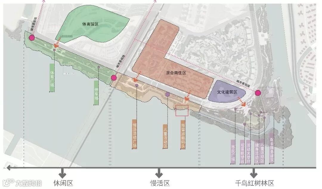慢活区与混合商住区用地相配套,主要设置了桥下活动空间、慢活活动广场、儿童活动区并预留了游艇码头功能。