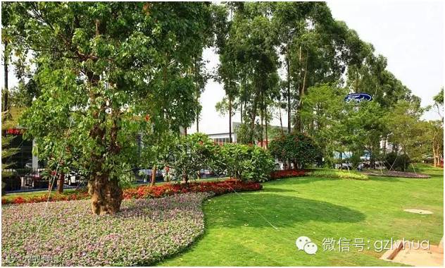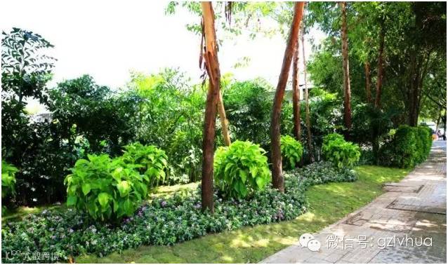 组团种植开花乔木,运用抽疏、草坪种植、时花点缀等手法进行升级改造
