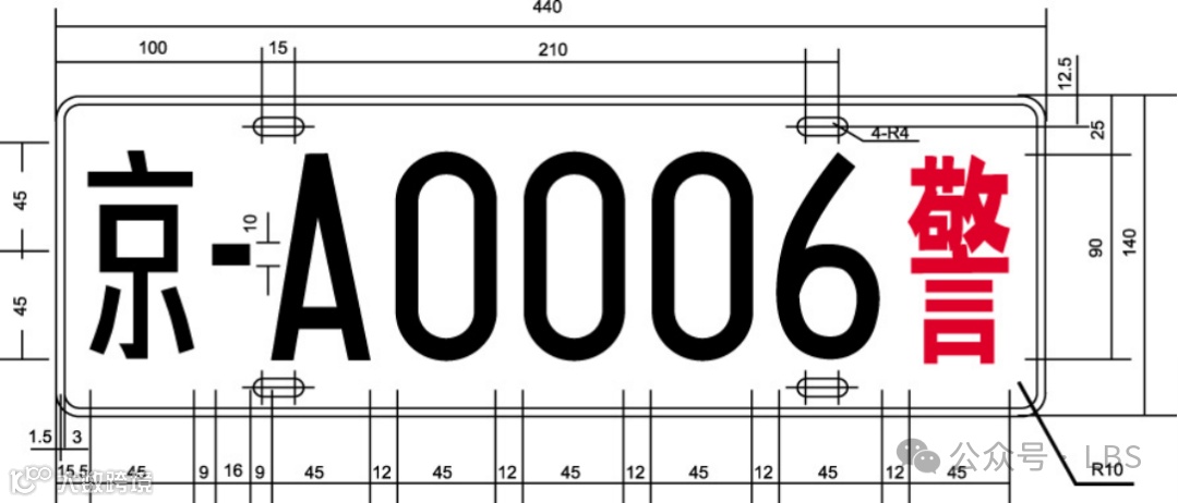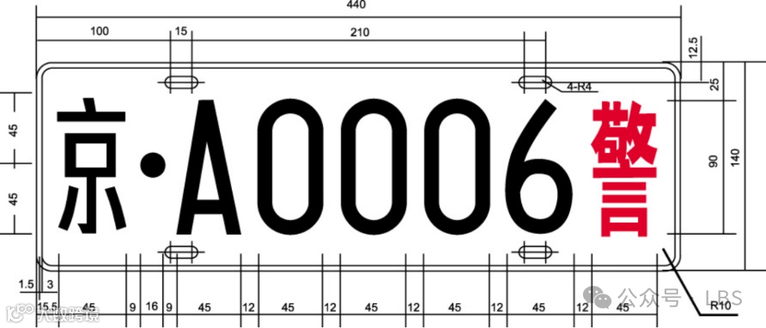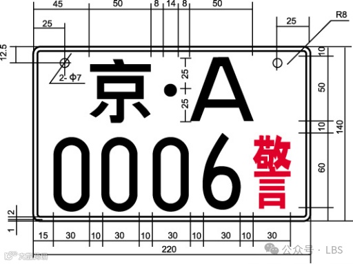 二、警用摩托车号牌为双排结构,尺寸为220mm×140mm。第一位至第二位在上排,第三位至第七位在下排。号牌与字符颜色、排列顺序及含义与警用汽车号牌相同。
