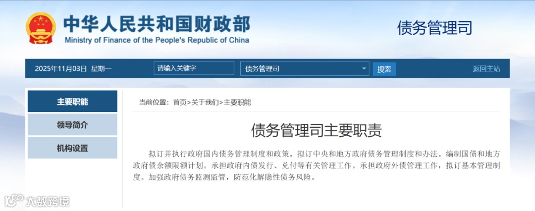 官网介绍,债务管理司主要职责包括:拟订并执行政府国内债务管理制度和政策。拟订中央和地方政府债务管理制度和办法。编制国债和地方政府债余额限额计划。承担政府内债发行、兑付等有关管理工作。承担政府外债管理工作,拟订基本管理制度。加强政府债务监测监管,防范化解隐性债务风险。