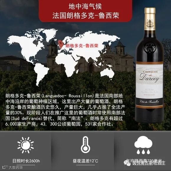 靠近西班牙边境的鲁西永产区,位在比利牛斯山脚,地势较朗格多克高且崎岖,朗格多克-鲁西永地区的葡萄酒,和谐,光照时间长,以西拉和歌海娜两种葡萄混合酿制而成。