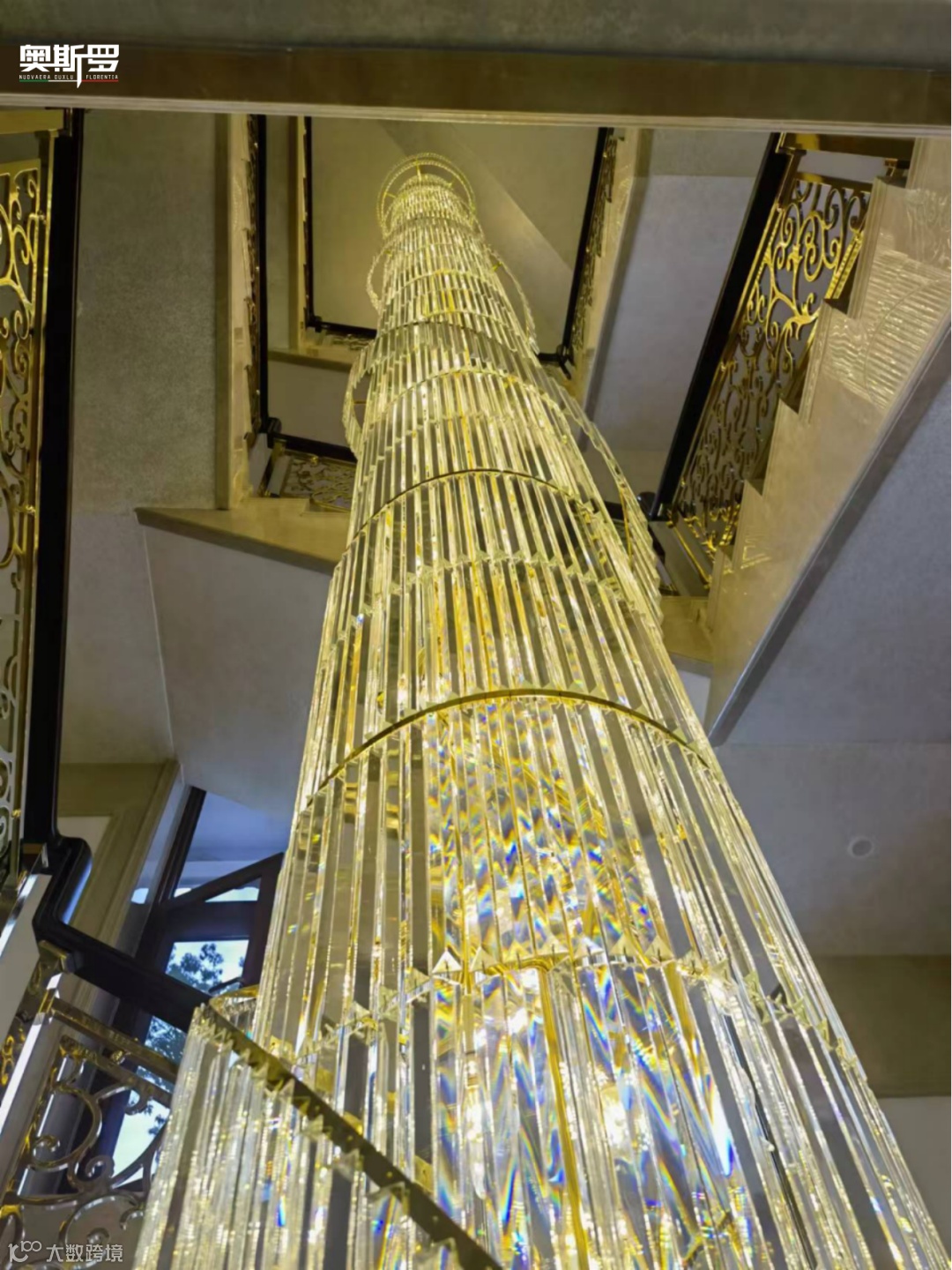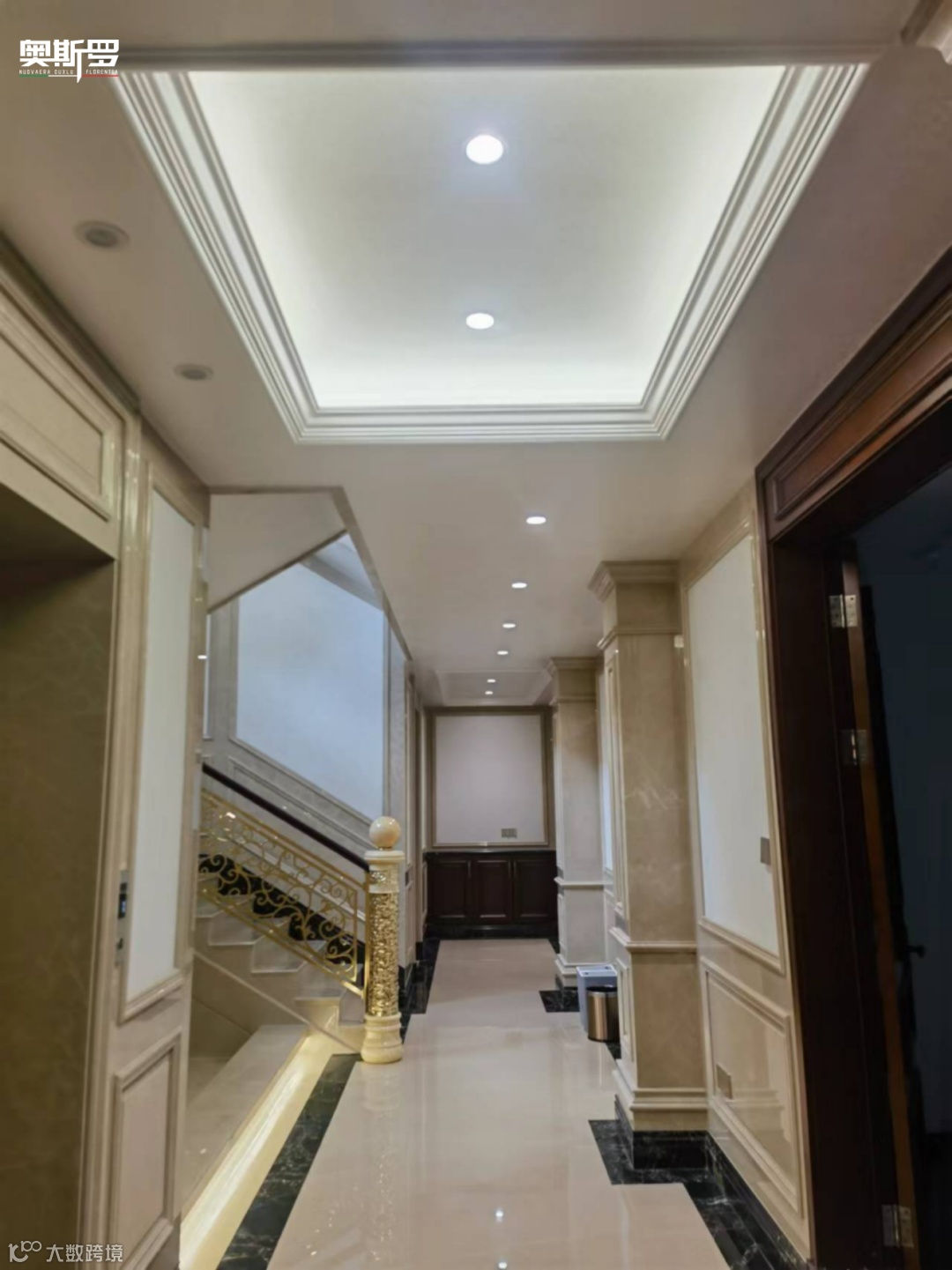 楼梯区域:通顶水晶灯垂落而下,美泰洛幻影天花将光线层层折射,与金色雕花栏杆、大理石台阶共同营造出纵深感,每一步都像行走在光影流动的艺术长廊。