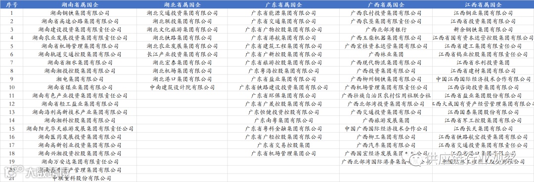 湖南、湖北、广东、广西及江西,这5个省份及省级行政区,共设立了87家省属国企。其中湖南省21家、广东省18家、广西省19家、江西省19家。