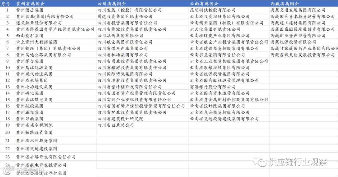 西南四省包括四川、云南、贵州和西藏,共70家省属国企,其中四川省19家、贵州省25家、云南18家、西藏8家。