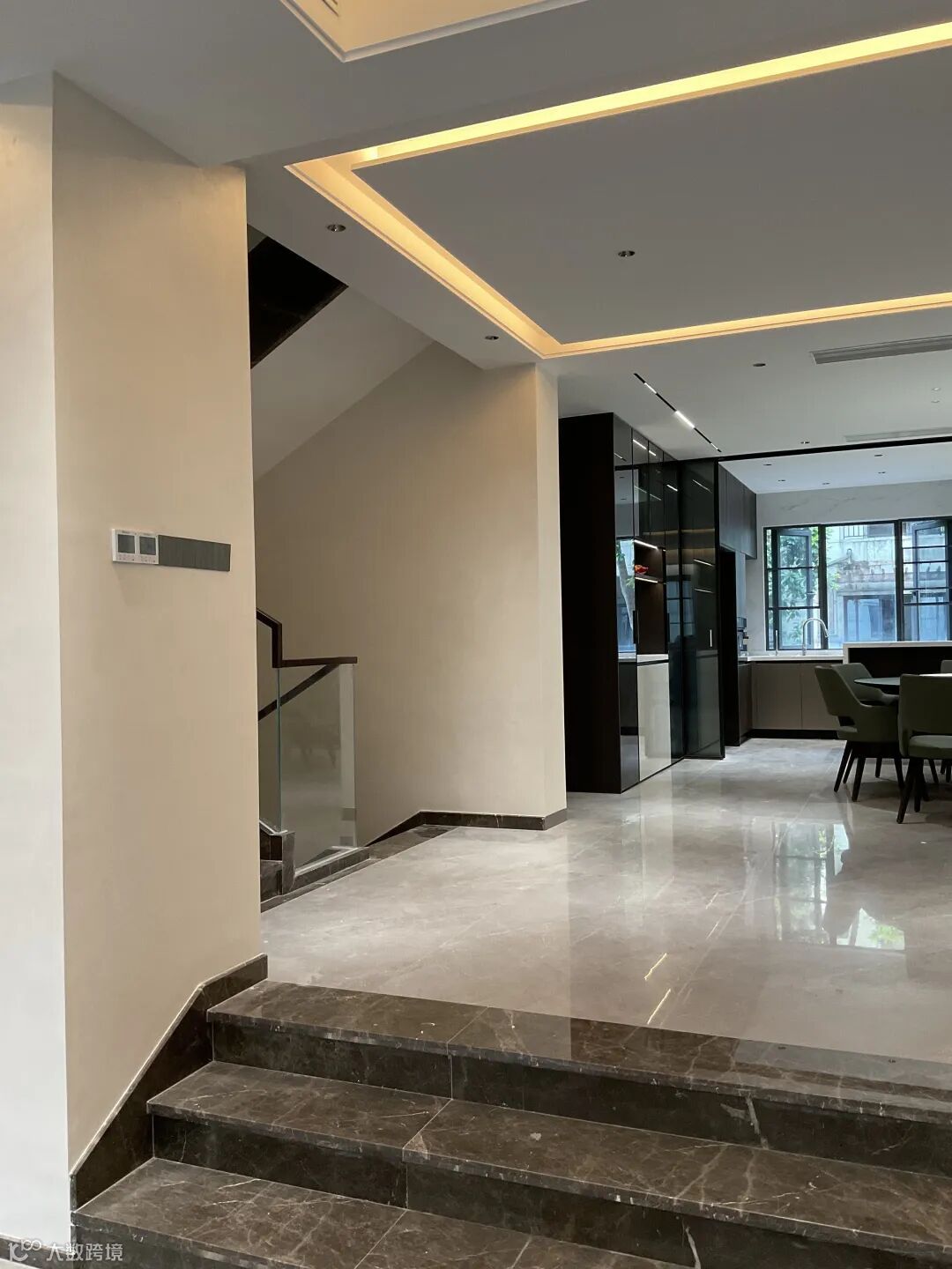 步入别墅,首先映入眼帘的是挑高开阔的公共区域。这里是家人相聚、宾客言欢的核心,线条利落的空间架构,搭配温润的大理石地面与通透的玻璃护栏,勾勒出现代豪宅的大气格局。而墙面,正是这场美学盛宴的点睛之笔。奥斯罗珍珠绒以细腻的姿态铺满客厅、餐厅与走廊,浅调的基底色柔和地晕染开,仿佛将月光揉碎后轻覆于墙面,没有丝毫的生硬感。