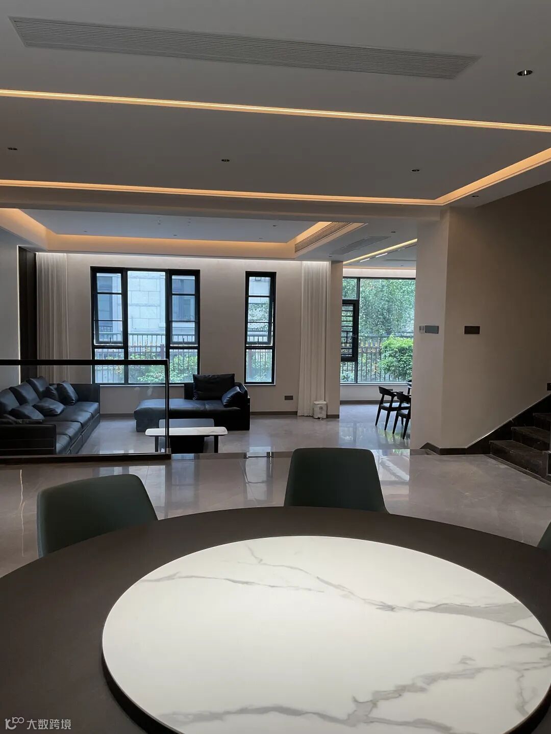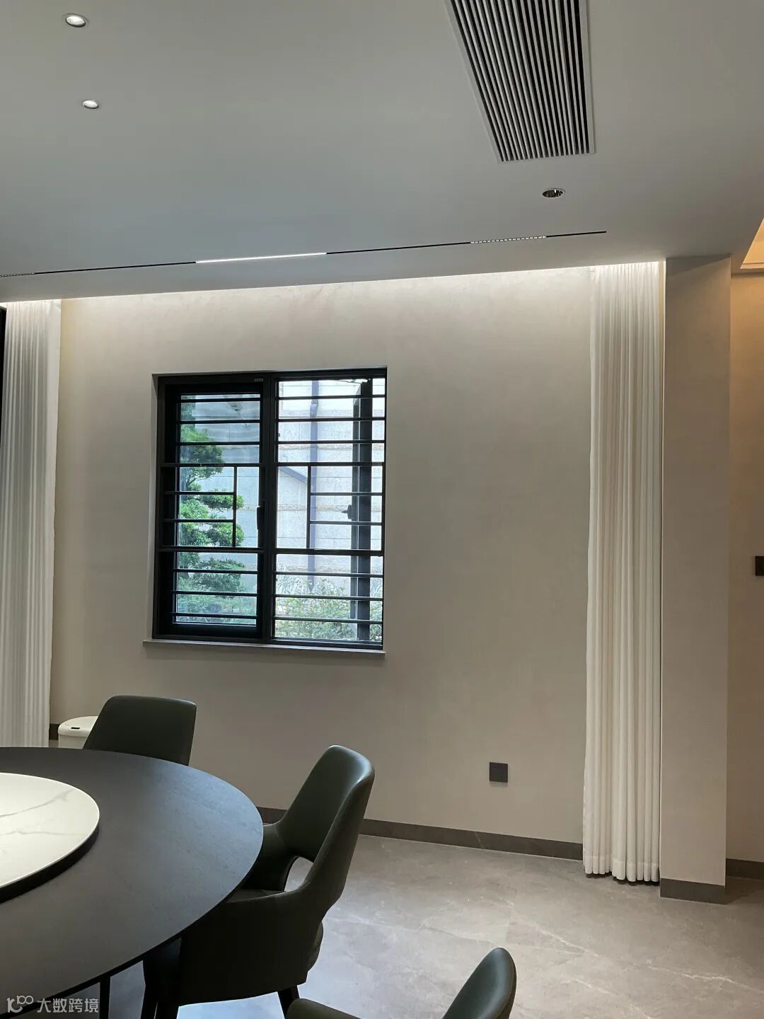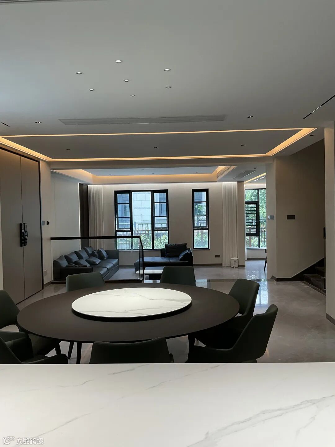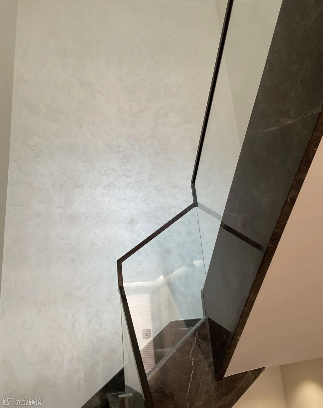 在暖黄线性灯带的漫射光影下,珍珠绒的肌理尽显精妙 —— 肉眼难辨的细腻颗粒均匀分布,随着视线的流转,墙面会漾开一层若有若无的珠光质感,似晨雾轻笼湖面,又似星河碎落人间。这份微光不张扬、不刺眼,却让空间的层次感瞬间拉满:开阔的客厅里,光影在墙面缓缓游走,与黑色皮质沙发的沉稳、大理石圆桌的温润相映成趣;通透的餐厅区域,圆形餐台的雅致与墙面的珠光质感相融,用餐的时刻便多了几分温馨与仪式感;连连接空间的楼梯区域,珍珠绒的细腻肌理包裹着深色大理石台阶,玻璃护栏的通透与墙面的柔光交织,上下之间,皆是从容与雅致。