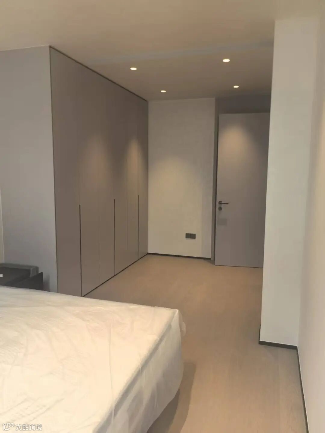 视觉上:墙面呈现出类似珍珠母贝的柔和哑光质感,低饱和的暖灰调在筒灯与线性灯的映衬下,散发出均匀且温暖的漫反射光,与浅木色地板形成温柔呼应。
