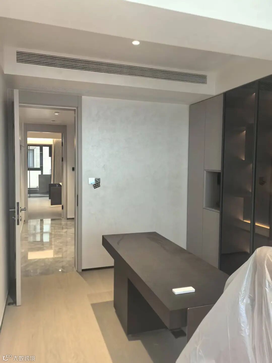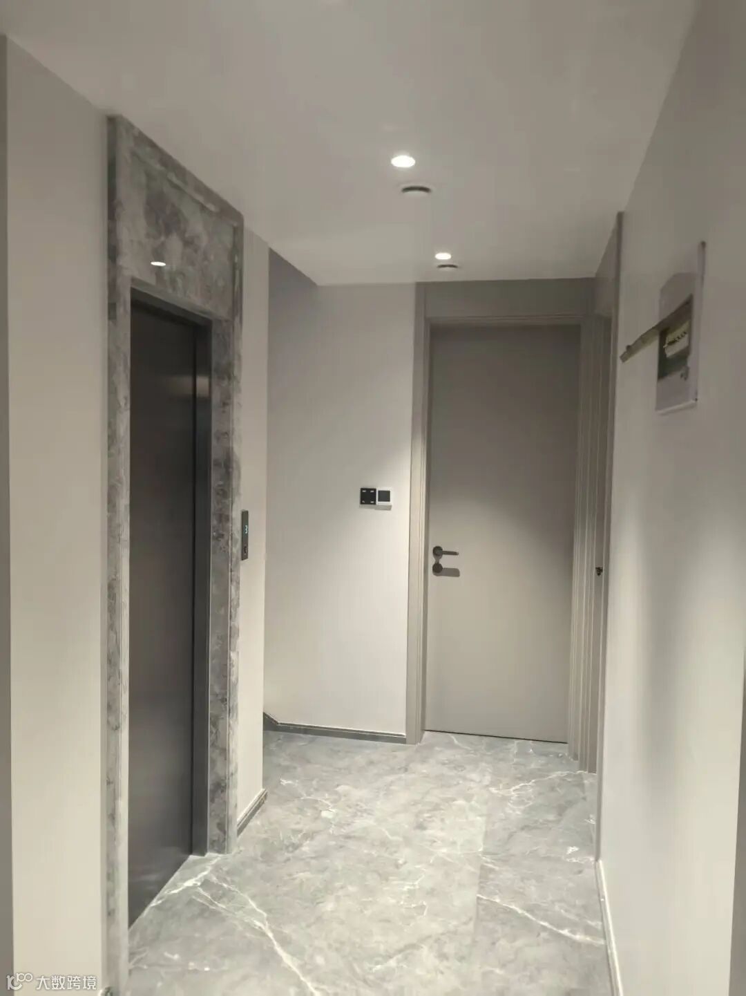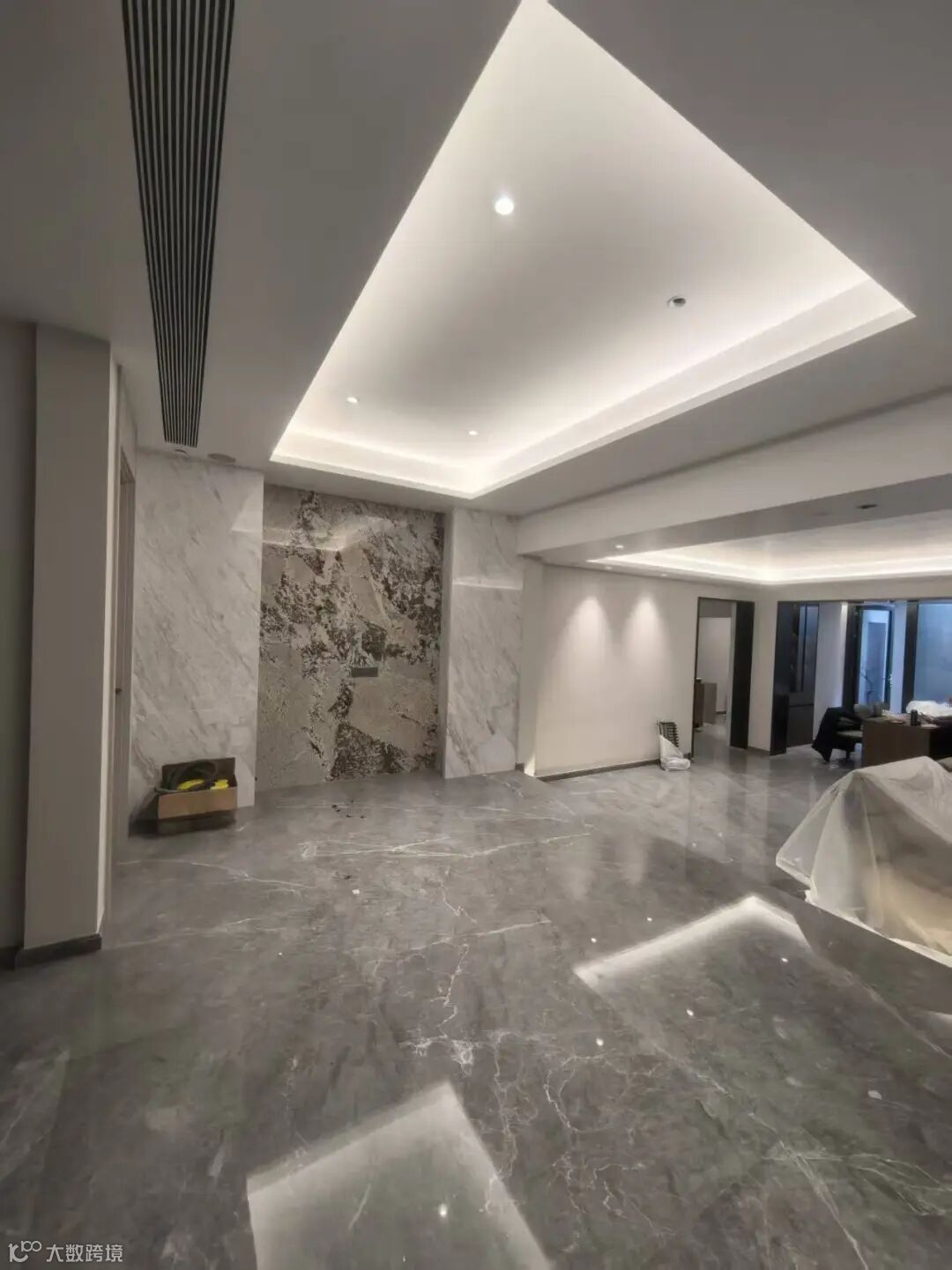 餐厅圆形吊顶的暖光漫射下,墙面皮纹在光影中呈现出层次丰富的明暗变化,与水晶吊灯的璀璨形成精致对比;电梯厅的石材立柱与皮感墙面衔接自然,哑光质感的涂料弱化了金属与石材的冷冽,让公共区域的奢华感更显温润。
