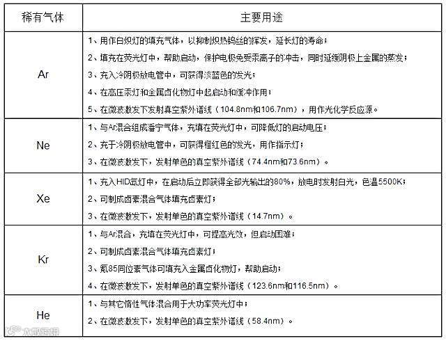 在电光源生产中,稀有气体是不可缺少的重要材料,几乎所有的灯内都要充入一种或几种稀有气体,它们或作为发光物质产生辐射,或用作填充气体延长灯的寿命等等。