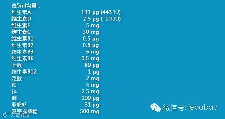 WellKID宝宝营养液,每5ml中含有500毫克的瑞士阿尔卑斯山的高山麦牙,能给宝宝提供健康自然的能量来源,成长中宝宝的身体还需要B族维生素包括B1、B2和叶酸,以便把麦芽等食物转化为能量所需要的碳水化合物。