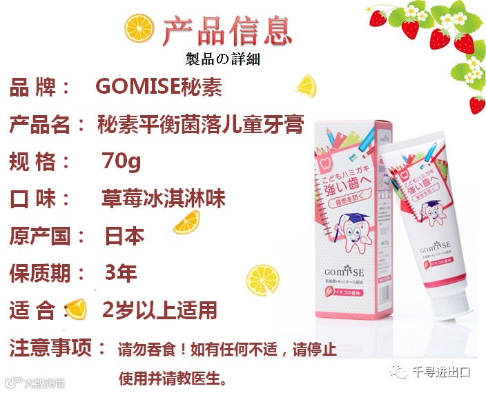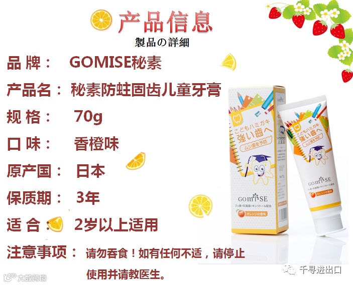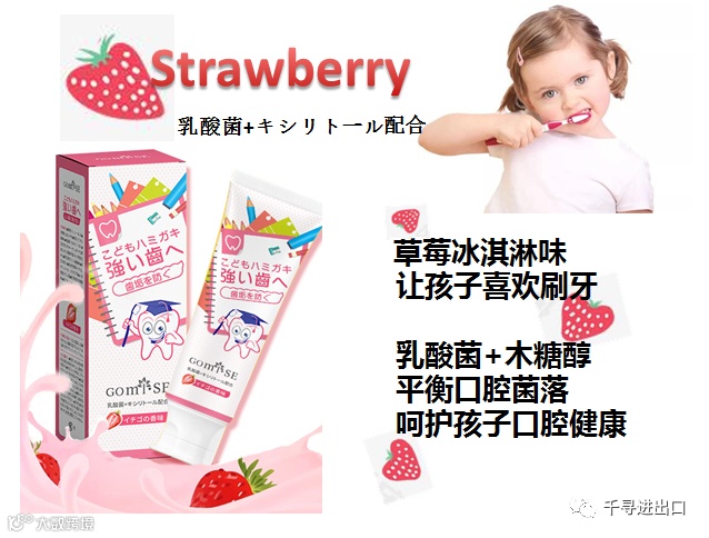 导读:日本原装进口儿童牙膏,清除缝隙间的牙垢,去除牙齿上的黄斑和污垢,强化牙质、防止龋齿。