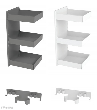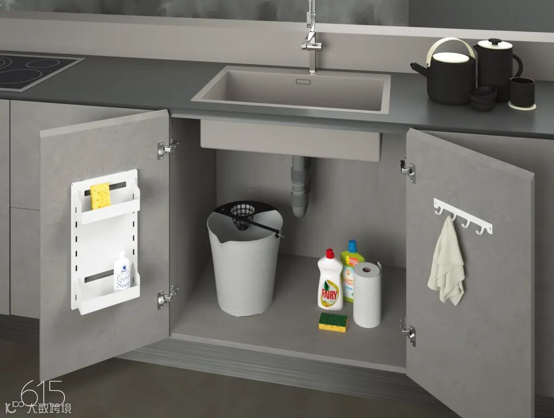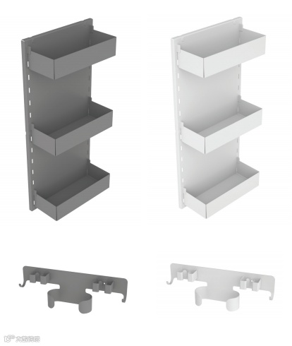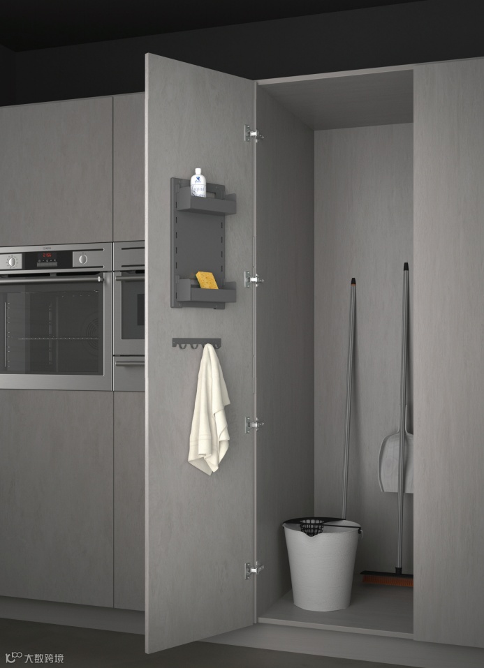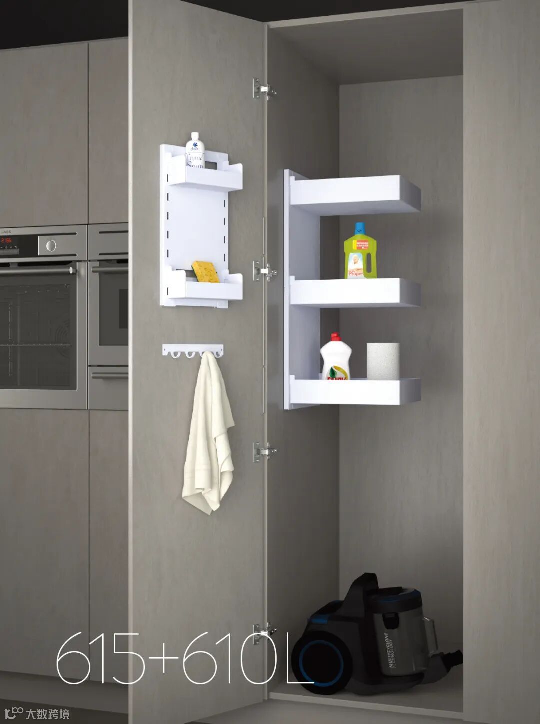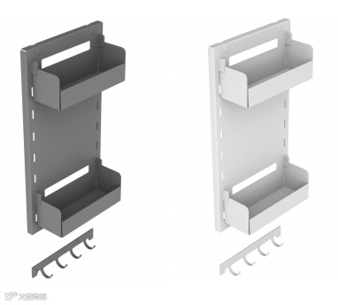 连门宝,门用储物柜套件,适用于最小300mm的橱柜,由两个结构组成,有两个架子和多用途的挂钩,上漆的金属板。