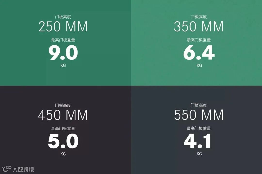 在承载能力方面,隐身门撑承重取决于门板的高度与重量,而门撑的规格则有三档可选。对于常规的门板高度,其对应的最高门板重量如下。至于其他规格的门板,格拉斯同样提供计算方式。若需进一步了解详细的技术细节,请参照目录或向您的销售经理咨询。