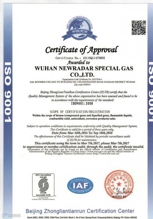北京中联天润认证中心(ZLTR)证明武汉纽瑞德特种气体有限公司的质量管理体系已经评审并符合ISO9001:2008质量管理体系标准使用条款的要求。