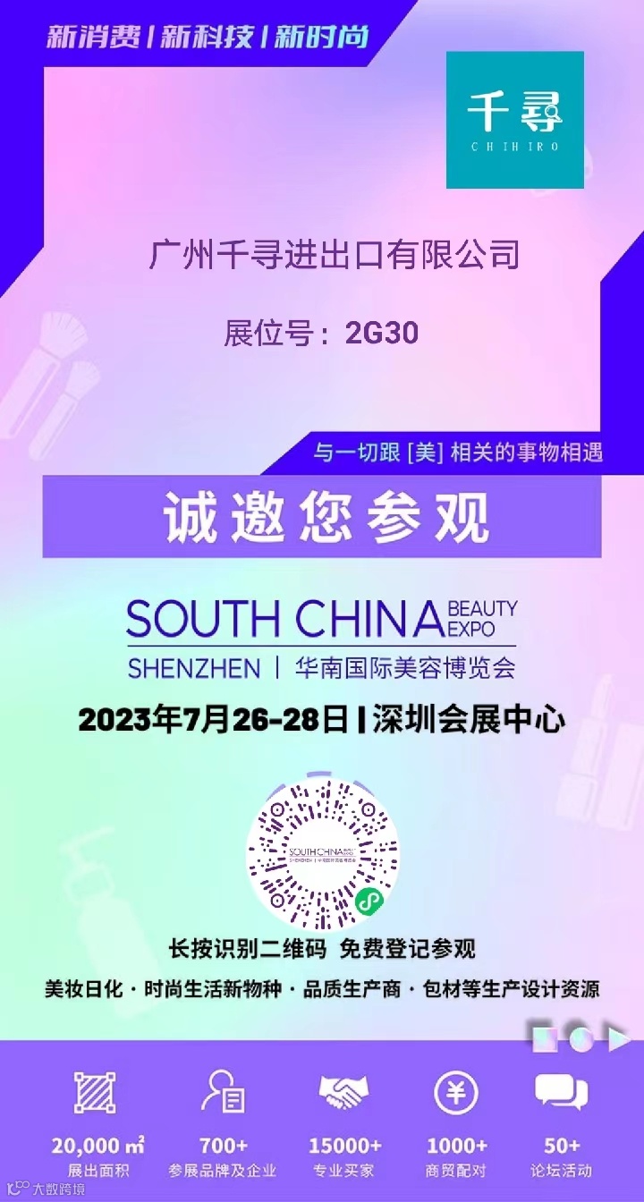 导读:2023华南国际美博会将于7月26-28日在深圳会展中心举办,千寻进出口在2G30邀您参观选品洽谈~