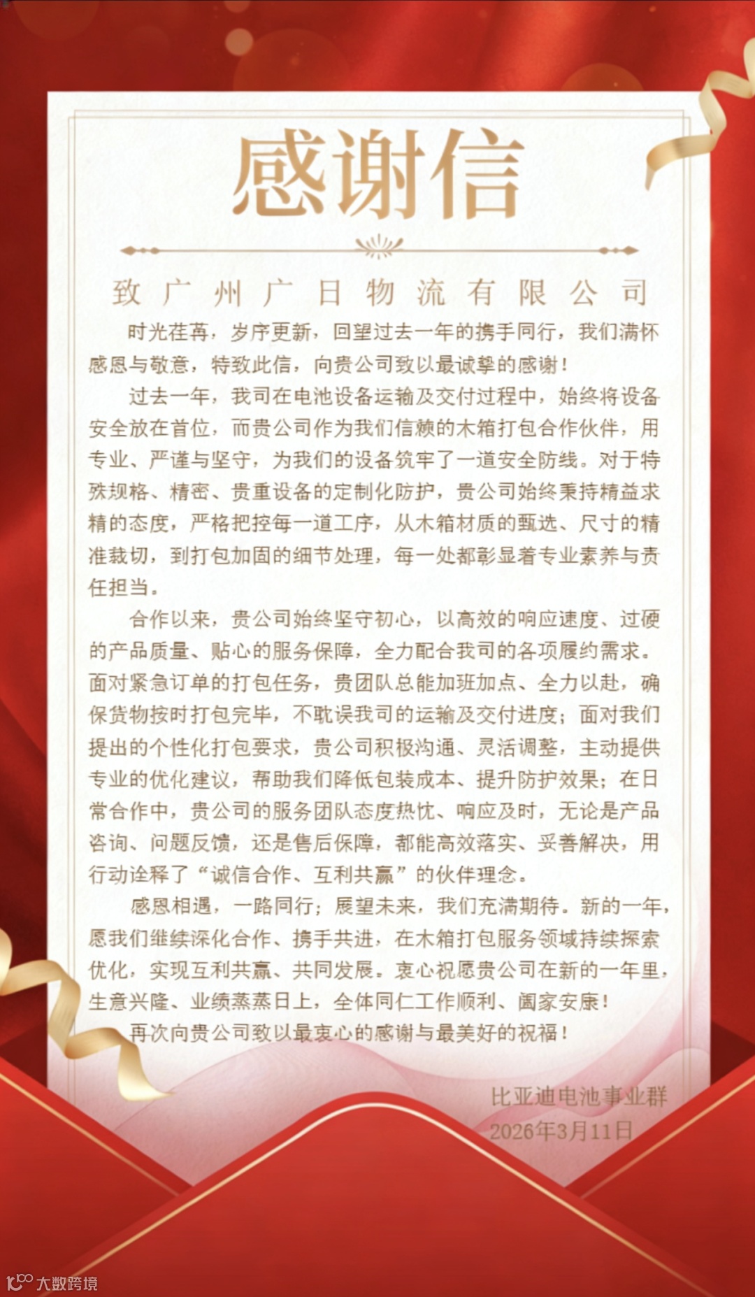 一封感谢信,一份认可,一份责任。广日物流将持续深耕新能源领域,锤炼专业服务能力,优化定制化包装及物流配套服务,深化与比亚迪电池事业群等广大客户的合作,以务实作风与专业实力,筑牢企业口碑,在互利共赢中实现高质量发展。同时,感谢比亚迪电池事业群的信任与支持,祝愿双方合作持续深化,共同实现更高质量的发展。