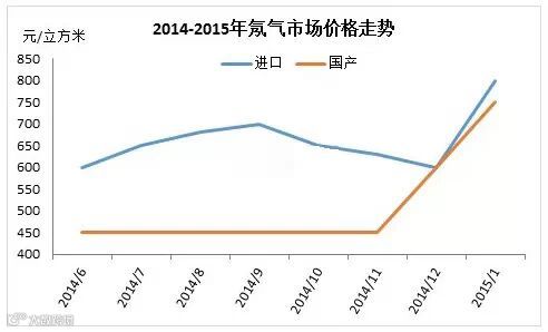 2014年电光源市场需求疲软,氖气由于供货量相对稳定,市场基本处于平衡状态。6-9月由于乌克兰清关,进口氖气数量受到限制,价格由600元/立方米上涨至9月份的700元/立方米,但由于市场需求并未开启,价格随之下挫,至11月份市场价降至600元/立方米。国产氖气市场相对平衡,12月底氖气出口采购发力,拉动市场价格飙升,11月国产氖气价格450元/立方米,至2015年1月价格上涨至750元/立方米,涨幅66.7%。