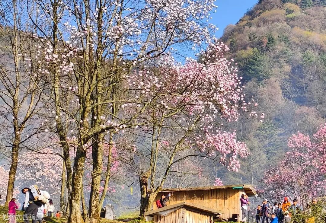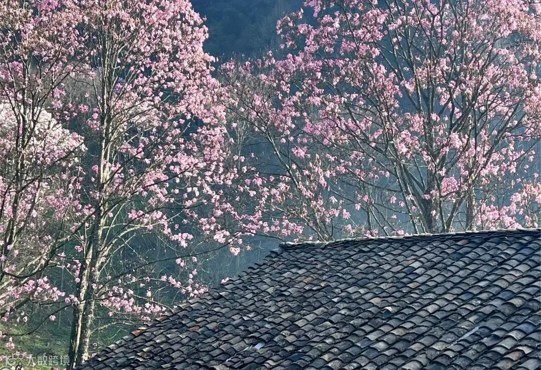 阳光晨雾下,辛夷花将梦幻的紫粉与热烈的红艳,洒向大地的调色盘。村落被远处的群山环抱,犹如心中向往的世外桃源。唐代诗人王维曾写下“木末芙蓉花,山中发红萼。涧户寂无人,纷纷开且落。”,想来便是咏赞此情此景。